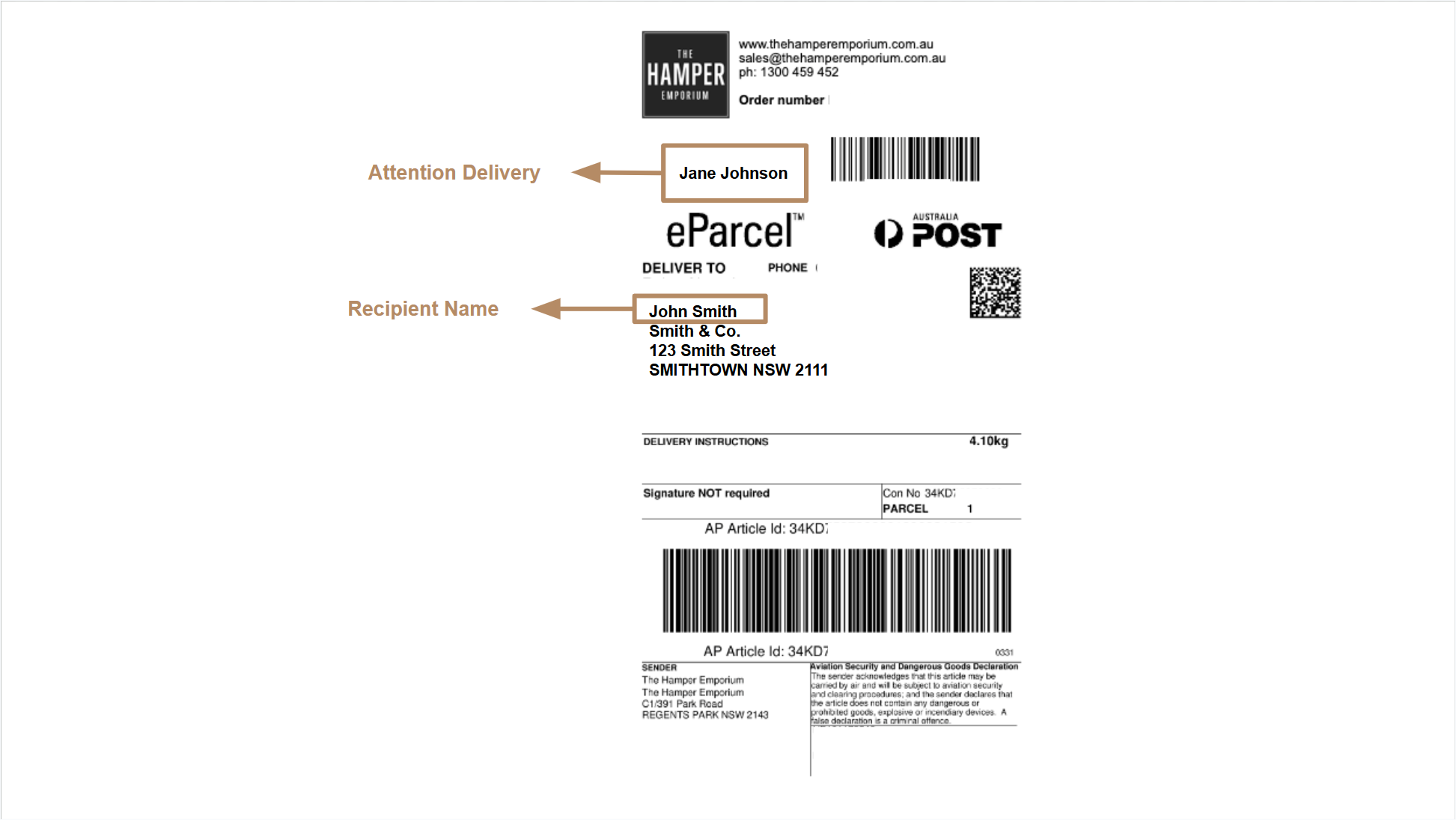 The example consignment below shows how the shipping label may appear, with callouts indicating where the Recipient and Attention To fields are displayed.